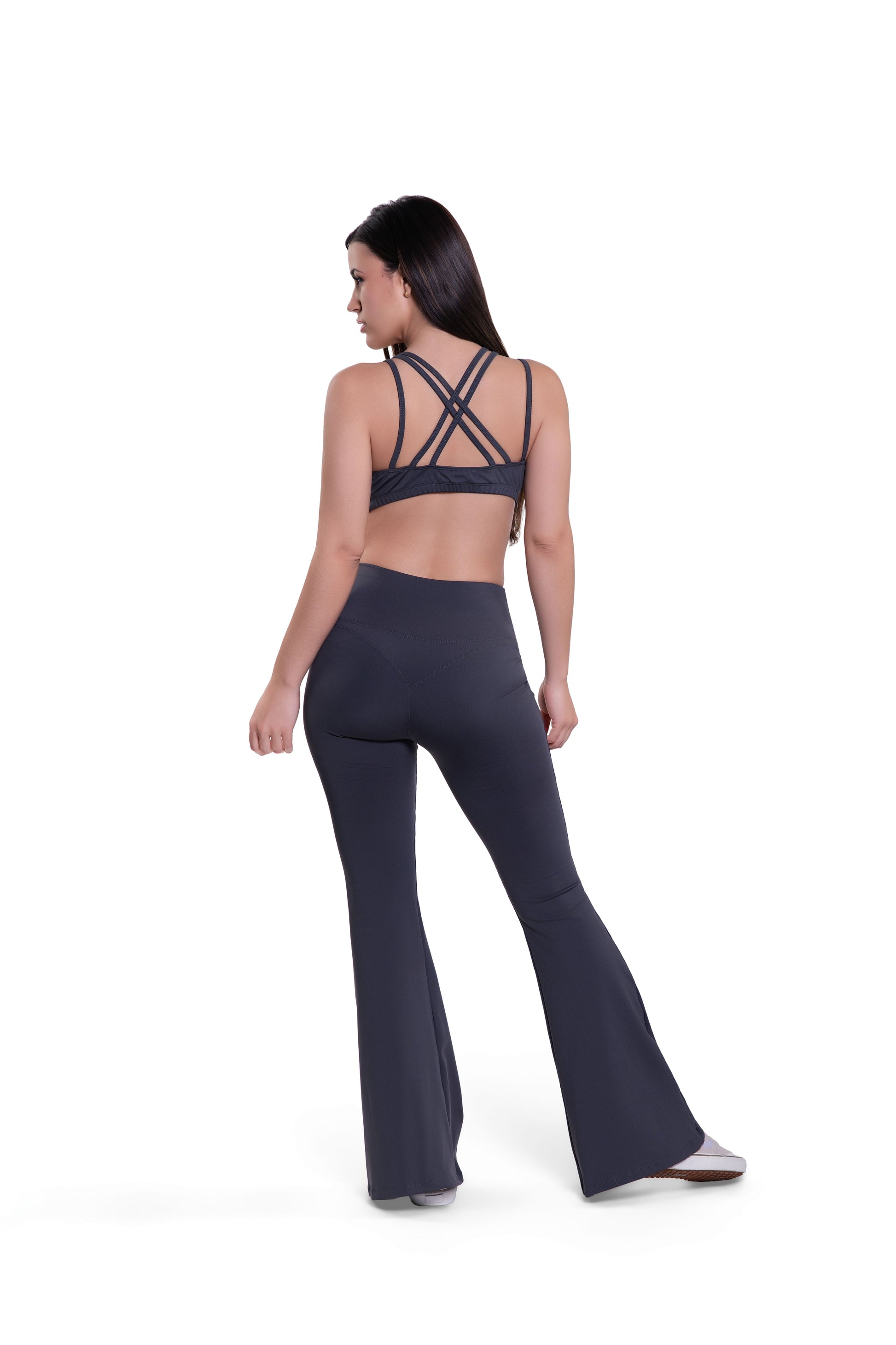 A sleek active set with a fitted top and bell pants that create a long, balanced shape. The fabric is soft with a steady stretch that supports without feeling heavy. The top offers a secure fit through the chest, and the bell pants open smoothly at the bottom for easy movement. The material keeps its color and stays comfortable through training or daily wear.