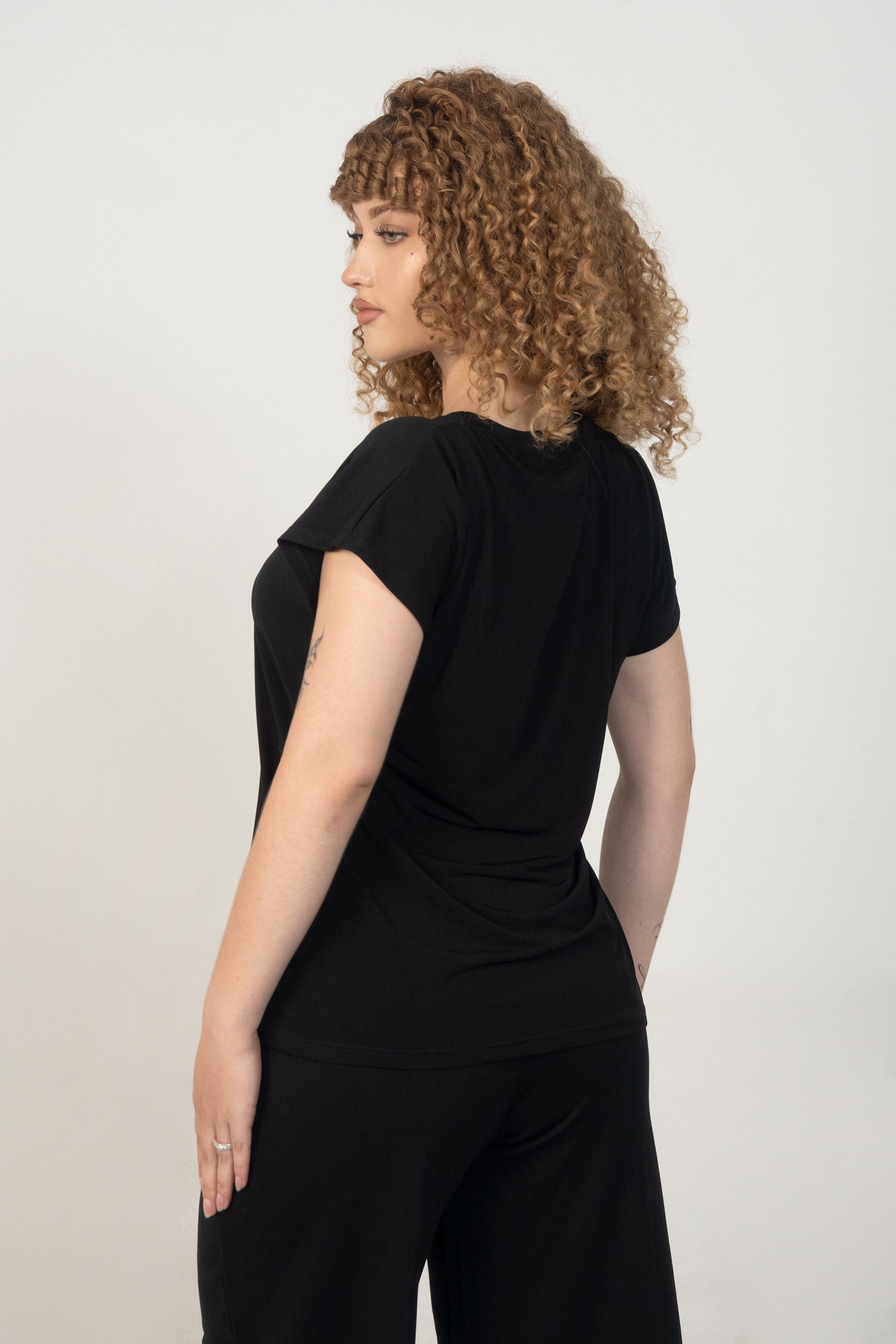 A Japanese sleeve blouse with a soft drape and a clean, modern shape. The relaxed sleeve design gives smooth movement without losing structure. The fabric keeps a rich black tone, feels comfortable on the skin, and is resistant to bleach, making it practical for salon environments.